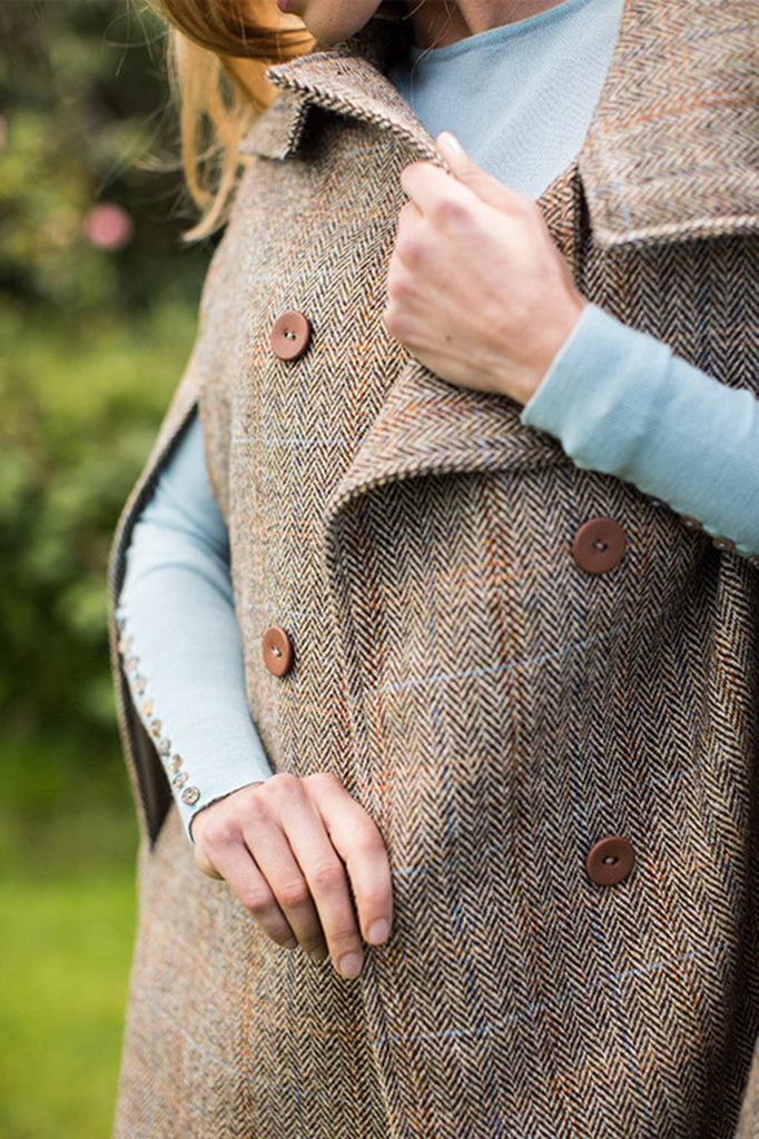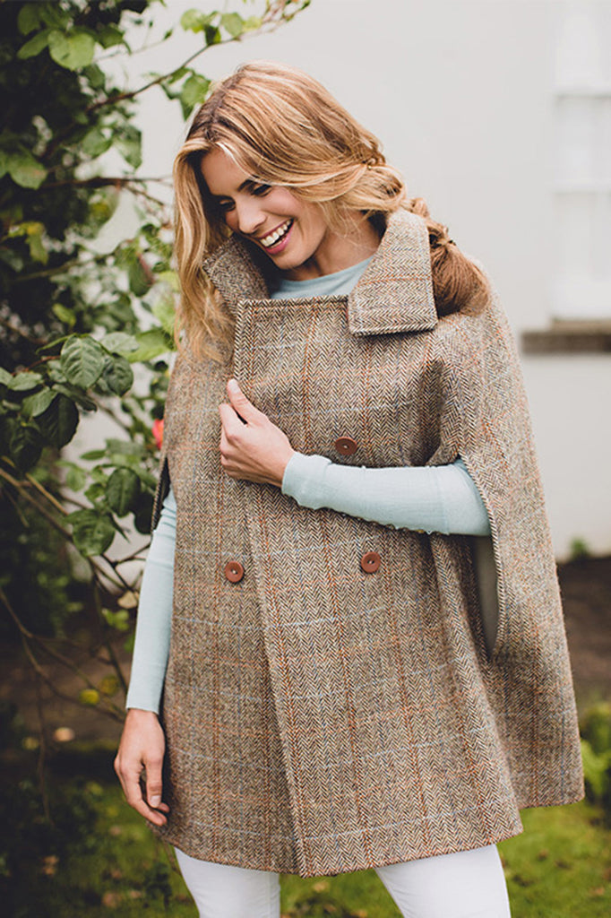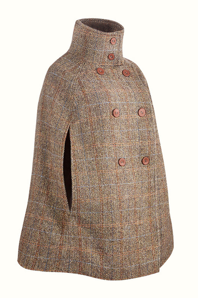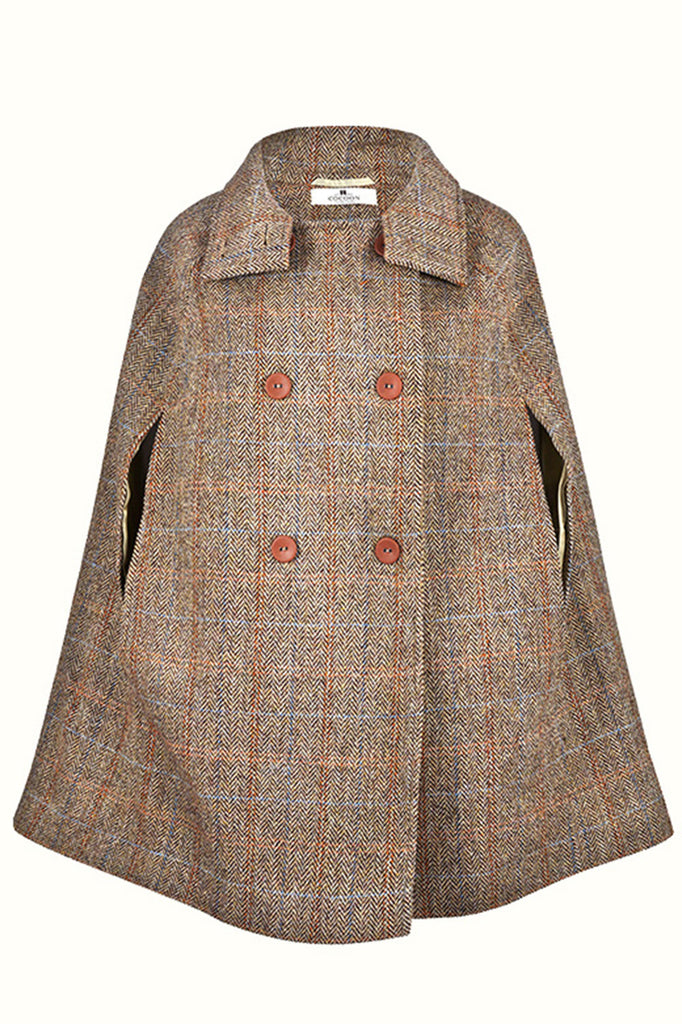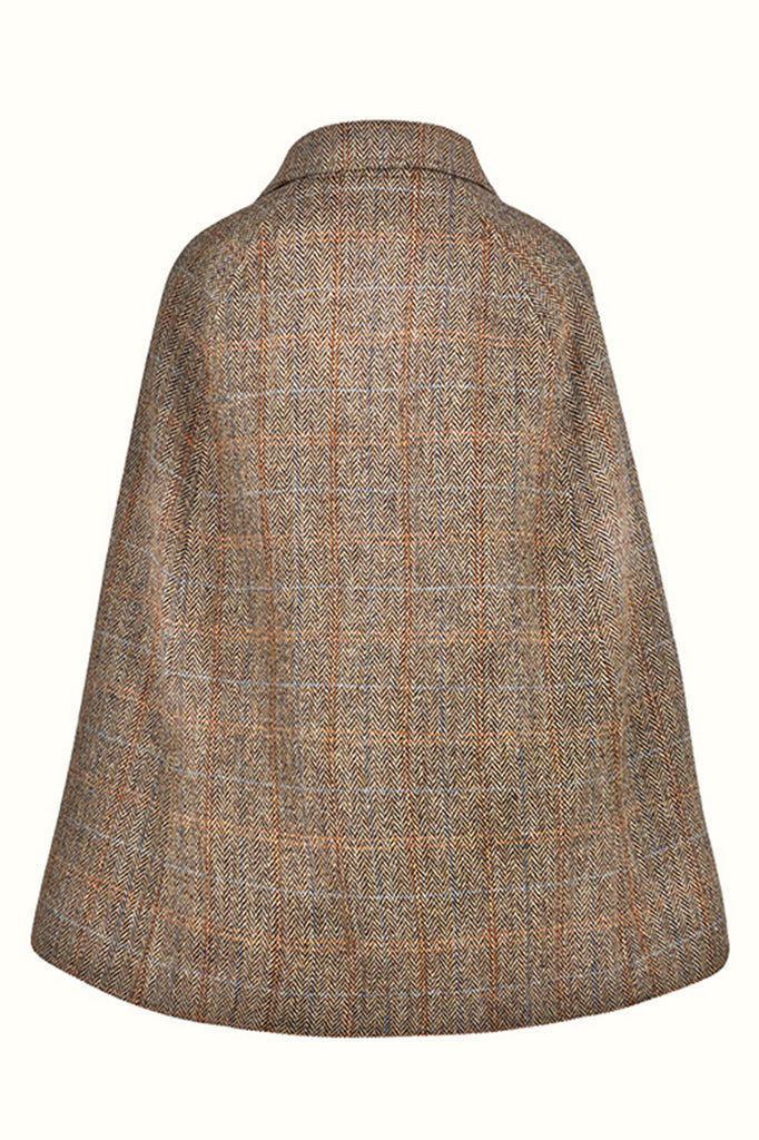 Luxuriously crafted with handwoven Harris Tweed, this golden hued cape is a modern twist on a classic design. Revered as a fabric, your Harris cape exudes heritage, style and quality – and the warm pattern will enhance your natural colors. Wear yours with collar high and unbuttoned & style with jeans and knee boots.
